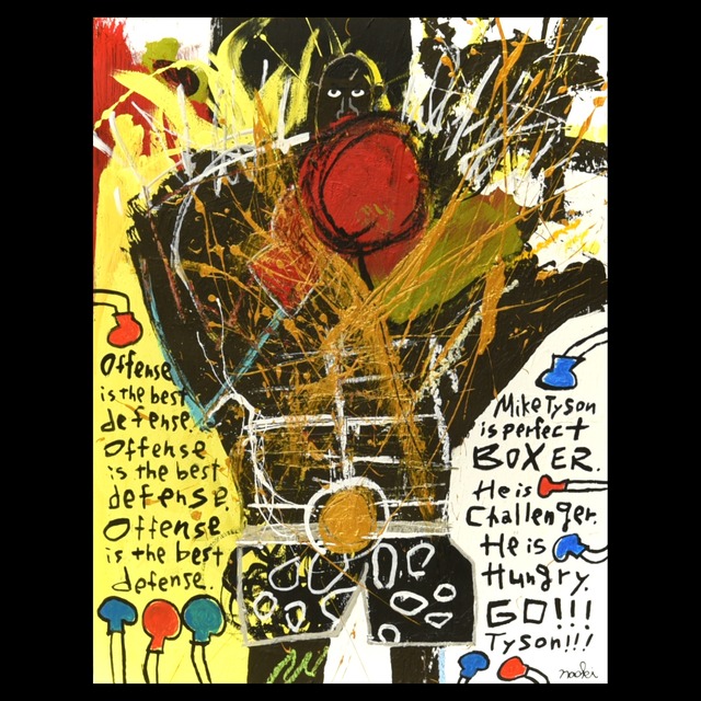 作品サイズ:F6(41.0cm×31.8cm) 使用画材:アクリル絵の具、オイルパステル、マーカー、木製パネル 昔から格闘技が好きで今でもよく観ているのですが 特にボクシングが大好きなのです。 中でも1番好きなボクサーがマイク・タイソン。 言わずと知れたアメリカの元世界ヘビー級統一王者。 Youtubeでもよくタイソンの試合を観てるのですが 圧倒的な破壊力を持ったストレートやフック 蝶のようにヒラヒラと相手の攻撃をかわすディフェンス 相手に近づいたり遠ざかったりする出し入れのスピード 試合中、どのタイソンも魅力的でいつも食い入るように観てしまいます。 そんなある日、いつものように試合の動画を観ている時に 「タイソンを書いてみよう」と突然思ったのです。 僕の普段の書き方で「これを書こう」と最初に決めて書くことはほとんどないのですが タイソンなら書きたいと思いました。 太い首、広い肩幅、筋骨隆々のゴツゴツした身体。 顔に無駄に線や色を入れてないのは 相手の攻撃を華麗にかわして綺麗な顔で試合を終える彼へのせめてもの敬意です。 子供が自分のノートにヒーローを書いているような そんな感覚で黙々とキャンバスに向かって書いている僕がそこにいました。 △▲△▲△▲△▲△▲△▲△▲△▲△▲△▲△▲△▲ BASEからではなく [email protected] に直接ご注文いただければ10000円OFFとさせていただきます。 撮影:Aozoraphotograph