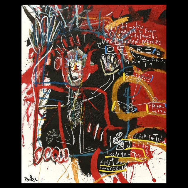 作品サイズ:F2(19.0cm×24.0cm) 使用画材:アクリル絵の具、マーカー、木製パネル 「I am that I am」を書く時に、マーカーで書いたのをキッカケに 「他のキャンバスに書く絵もマーカーは使えるんじゃないか?」 と思ったのがキッカケで書いた作品です。 マーカーの書き心地が想像以上によくて、普段使ってる画材との相性もよくて、自分の中で可能性が一気に広がったような気がして アトリエで1人でテンション上がってしまいました笑。 昔からTHE BLUE HEARTS の曲が好きなのですが ボーカルの甲本ヒロトさんが前にテレビ番組で 「同じものを見ていても、みんなそれぞれ合うピントが違ってる」みたいなことを言っていて 例えば「部屋で同じ方向を見ていても、椅子にピントが合っている人もいれば、机を見ている人もいる」とのこと。 甲本さんは「僕はたまたま中学生の時にロックにピントが合っただけ」と言っていました。 他の同級生の耳にもロックは聴こえていたはずなのにピントは合わなかったのでしょう。 4年前のあの日、僕は服屋さんでTシャツにプリントされたバスキアの絵を見て 「俺もこういう絵が書きたかったんやぁぁぁ!」 と心が震え、そこから絵にどんどん興味が湧いてきました。 あの服屋さんで同じTシャツを見た人は山ほどいたと思います。 でも、そこに書かれた絵に強烈にピントが合ったのは僕だけやったんでしょう。 「ピントがヒント」「ヒントがピント」なのです。 △▲△▲△▲△▲△▲△▲△▲△▲△▲△▲△▲△▲ BASEからではなく [email protected] に直接ご注文いただければ10000円OFFとさせていただきます。